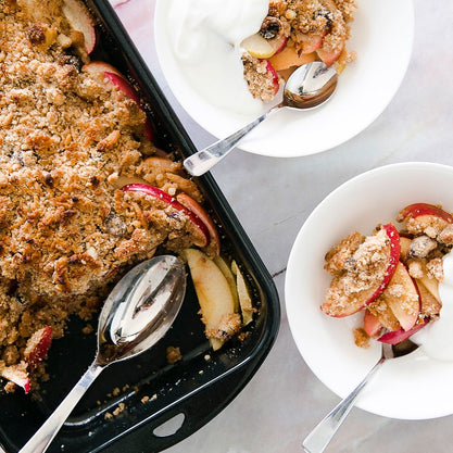 - Für den Crumble, alle nötigen Zutaten in eine Schale geben und vermengen. Gleichmäßig auf dem Obst verteilen und 15 Minuten im Ofen backen.