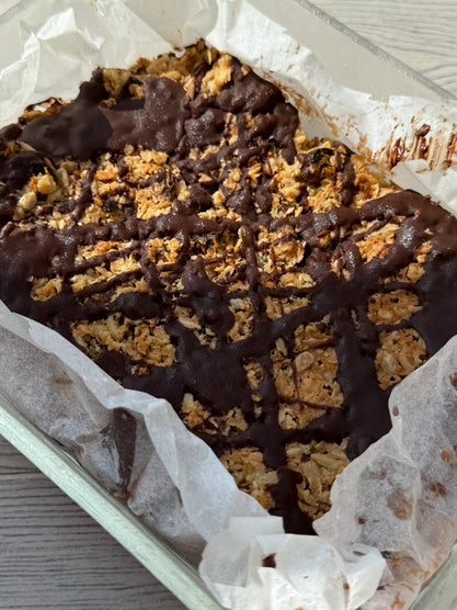 Diese Riegel sind vollgepackt mit guten Zutaten: Haferflocken bringen komplexe Kohlenhydrate und Beta-Glucan (gut für den Cholesterinspiegel!), Sonnenblumenkerne liefern Vitamin E, Magnesium und gesunde Fette, Tahini oder Nussmus gibt Protein und Cremigkeit, und das Ghee liefert fettlösliche Vitamine. Die dunkle Schokolade? Die macht nicht nur alles leckerer, sondern bringt auch Antioxidantien mit!