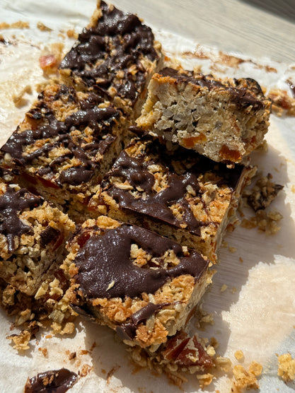 Ein gesunder, nahrhafter Müsliriegel mit Haferflocken, Sonnenblumenkernen und einem Hauch Schokolade… ganz ohne Datteln, aber dafür mit einem meiner Lieblings-Superfoods: Aprikosen! 😍