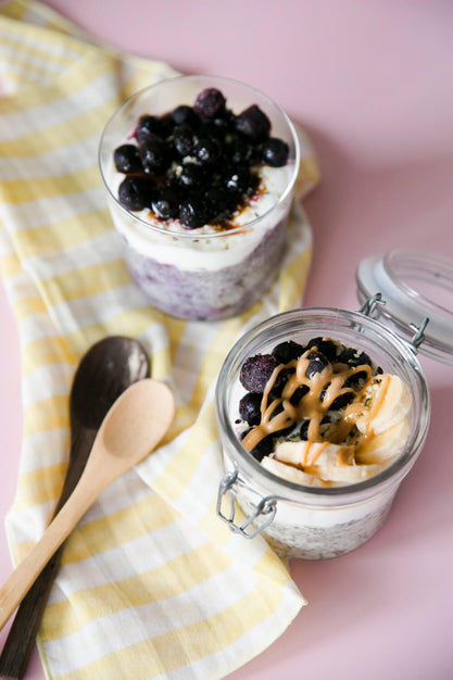 - Für das Topping, die gefrorenen Blaubeeren und Vanilla in eine kleine Pfanne geben und erhitzen. Vor dem Servieren auf den Pudding geben und noch mit Erdnussbutter und Kokosjoghurt servieren.
