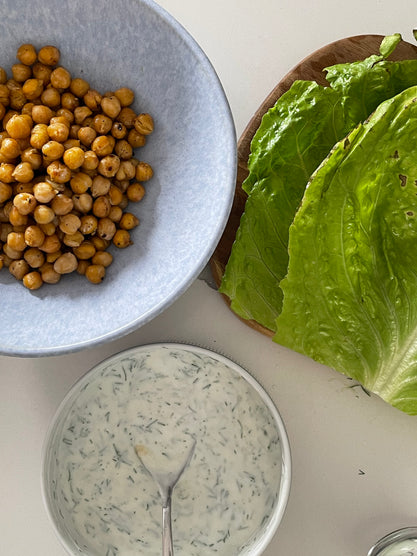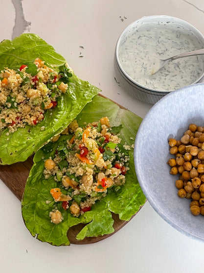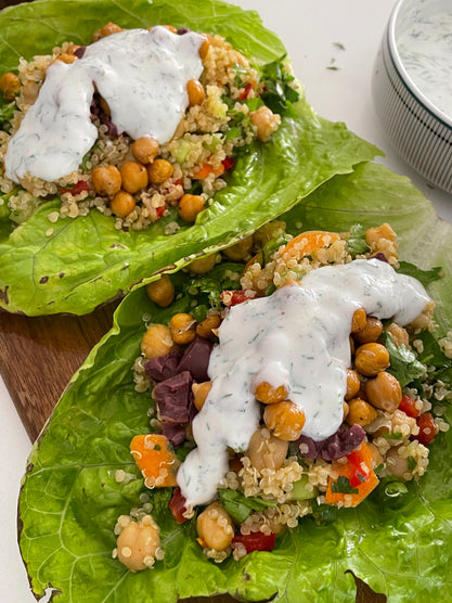 Diese Wraps sind das perfekte Beispiel für darmfreundliches Essen: knusprige Kichererbsen voller Ballaststoffe, nährstoffreicher Quinoa, buntes Gemüse und probiotischer Joghurt – alles verpackt in frischen Römersalatblättern. Das ist Darmliebe pur! ✨