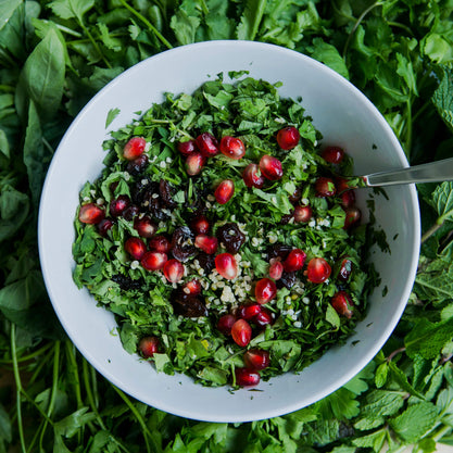 Dieser Salat ist ein wunderbarer Beilagensalat. Ich esse ihn besonders gerne zum Huhn oder zu anderen Fleischgerichten. Die Mischung aus Kräutern gibt jedem Essen noch mehr Geschmack und Frische. Die Kombination aus bitteren Kräutern und frischen Granatapfel ist einfach großartig! Dieser Salat ist eine super Alternative zum typischen grünen Beilagensalat.