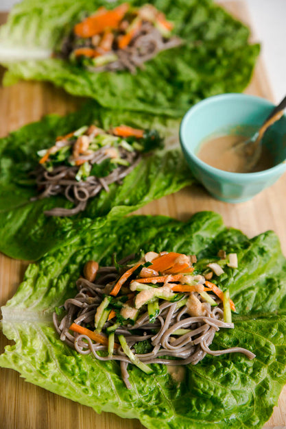 - Die Salatblätter auf ein Brett legen und den Nudel Salat darauf verteilen. Zusammenrollen und genießen!