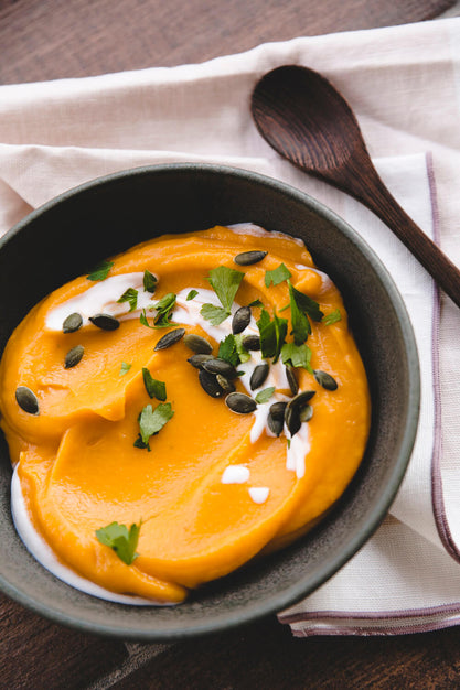 - Mit einem Handmixer pürieren und mit Harissa Paste und Kokosjoghurt servieren.