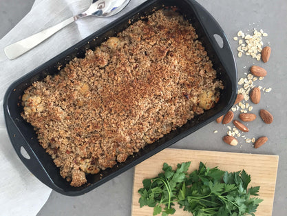 Aufläufe sind für mich der Inbegriff von Hausmannskost im Winter. Als ich klein war gab es bei uns regelmäßig Kartoffelauflauf mit Creme Sauce. Das war zwar super lecker, entspricht aber gar nicht mehr dem wie ich heute koche. Stattdessen habe ich mir eine vegane und super leckere Version überlegt die auch den großen Hunger durch die knusprige Nussgarnierung sättigt. Statt klassischer Cremesauce gibt es bei mir Kokssauce, diese ist nicht nur genauso schön cremig sondern auch viel gesünder.