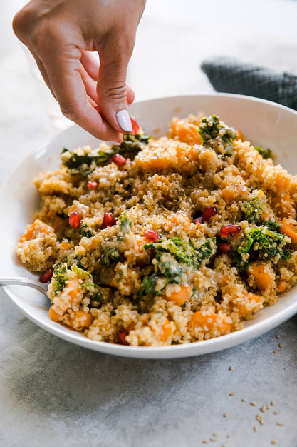 - Den Grünkohl mit den Händen in mundgerechte Stücke reissen und dazugeben. Köcheln lassen bis der Quinoa und die Süßkartoffel durch sind.