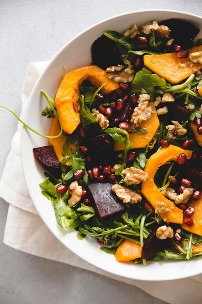 - Die gekochte rote Beete in mundgerechte Stücke schneiden. Den Rucola waschen, halbieren und in eine große Salatschüssel geben. Die Rote Beete, Walnüsse und Granatapfelkerne dazugeben. Den fertigen Kürbis dazugeben.