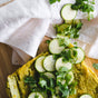 - Die Zweite Zucchini in feine Scheiben schneiden und frische Kräuter hacken.